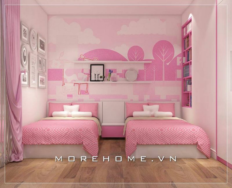 Nội thất phòng ngủ bé gái ấn tượng với gam màu hồng phấn đáng yêu, 2 chiếc giường đơn được bố trí khoa học đặt song song với nhau giúp con có thêm khoảng không gian riêng tư và thoải mái hơn